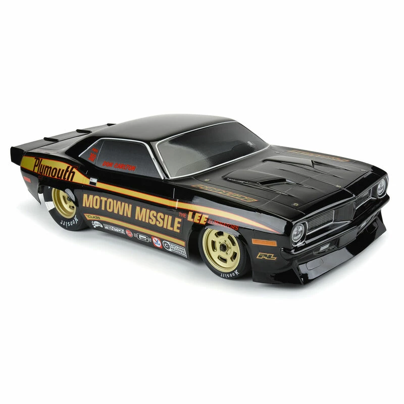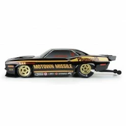 Pro-Line is proud to introduce one of the most iconic Pro Stock bodies of all-time: the Motown Missile! In 1972, fully backed by Chrysler, MOPAR began to secretly develop a Barracuda into the ultimate Pro Stock drag car and “The Missile” was born. It was driven by Don Carlton and the rest, as they say, is history. Now you can have your very own fully licensed replica of the 1972 Plymouth Barracuda Motown Missile Edition Tough-Color Black body for your No Prep Drag Car! This body is made from pre-colored black body material, so you never have to worry about paint chipping or peeling off, hence the name Tough-Color. This body includes high-quality Motown Missile graphics that perfectly match those found on the original version of this iconic dragster. We recommend using our Hoosier 2.2″ Drag Racing Front Tires (PRO10158203) on the front and Hoosier Drag Slick SC 2.2″/3.0″ Drag Racing Tires (PRO10157203) in the rear, and painted Slot Mag Drag Spec Wheels (PRO279205/PRO279305) to complete the ultimate hot-rod look. Get your own Motown Missile Drag Body today!