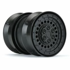This is a pair of Carbine 1.9″ Black Plastic Internal Bead-Loc Dually Wheels. Pro-Line is proud to introduce our Carbine 1.9″ Dually Wheels! This pair of Carbine dually wheels will go perfectly with your next military-style or extreme off-road build and will fit 4 standard 1.9″ tires, 2 tires per wheel. The best part of the Carbine is the modular wheel design that allows it to be used as a single tire wheel, dual tire wheel, or you can keep adding as many tires as you want with the addition of more Carbine wheels! The face of the Carbine 1.9″ wheel features 20 small holes with molded-in bead-loc detail for a tough military look. The included scale wheel nut cover attaches with two screws and completes the rugged appearance. The Carbine Dually wheel includes two optional 12mm hex offsets to fit both straight axles and portal axles and to give you the option for a narrow or wide offset. If you are looking for dually wheels for your build, then look no further than the most advanced wheels to date. Get your very own pair of Pro-Line modular Carbine 1.9″ Dually Wheels today!