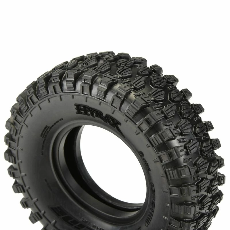 This is a pair of Class 1 Hyrax 1.9″ Rock Crawling Tires in the Super Soft Predator material. The future of Class1 Tire Performance has arrived with Pro-Line’s 1.9” (4.19″ OD x 1.4″ Width) Hyrax Tire! Designed from the ground up for maximum grip on the toughest terrain, the Class 1 legal Hyrax tire is ready for anything your Scale Adventure might throw at you. The Hyrax is now available in the softest Rock Crawling Rubber ever made: The Predator Compound! The Super Soft Predator Compound excels on wet or ultra-low traction surfaces to give you grip like you have never experienced before. The Hyrax features an aggressive and open tread pattern with each tread block containing multiple Sipes for incredible tread flex while still looking great on a Scale Rig. The highly detailed connected tread on the sidewall of the Hyrax extends out for unmatched side-hilling performance and the futuristic stepped tread blocks create even more forward gripping edges that dig into slick rock like no other scale tire Pro-Line has produced to date! The Hyrax is made from Pro-Line’s Super Soft Predator Compound, so you know it provides performance you can depend on.