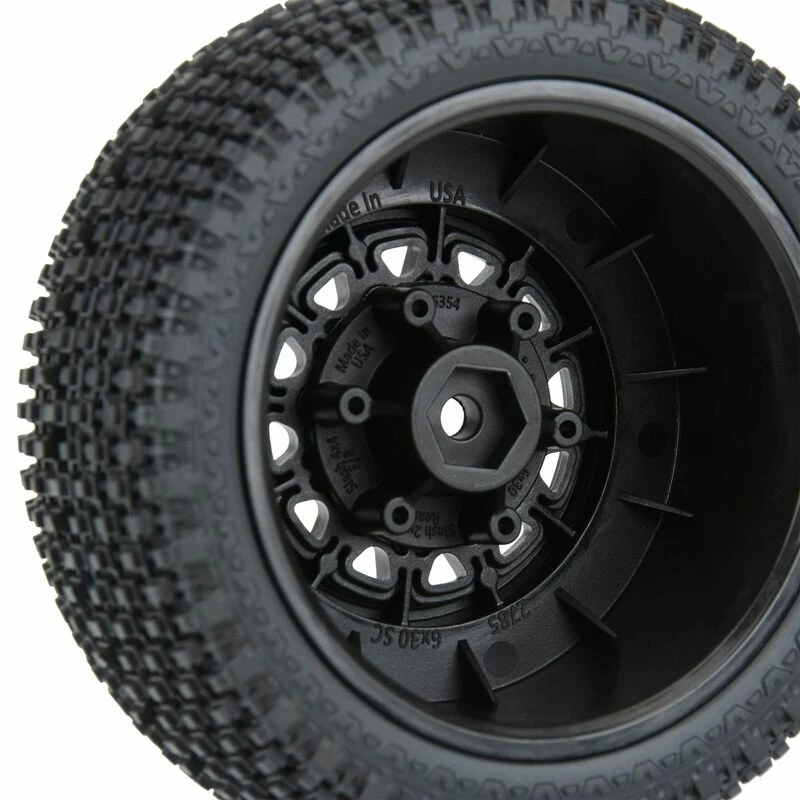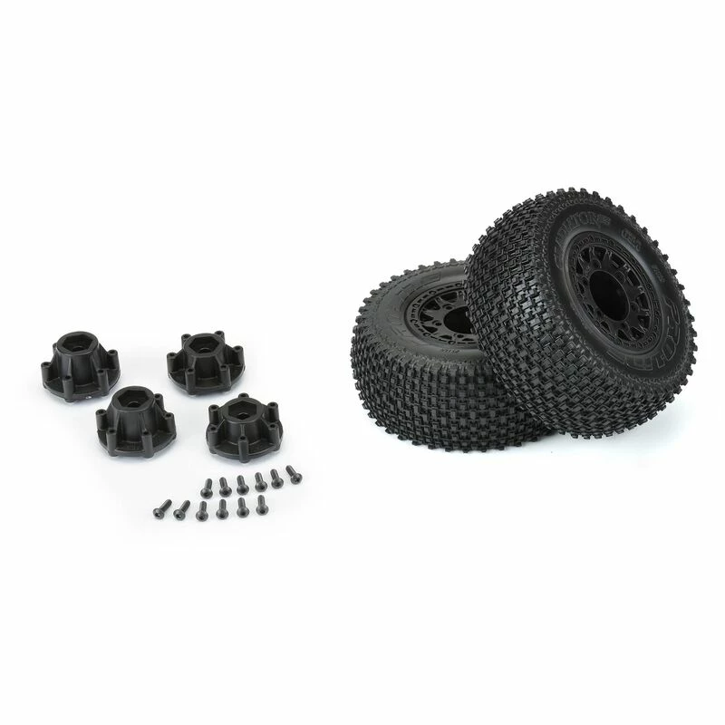 The Gladiator SC tires are mounted to a pair of Raid SC Removable Hex Wheels. We take the guesswork out of your glue job by doing the mounting for you so you can spend your time having fun! Pro-Line is proud to introduce a true next-generation Short Course wheel design the Raid 2.2″/3.0″ Removable Hex Wheel for all Short Course Tires! Imagine being able to easily change the offset of your wheel to fit different applications by simply changing out the hex! Now you can with the new 6×30 Removable Hex system from Pro-Line. The wheels include a pair of 12mm Slash® 4×4 Front/Rear (Slash® 2wd Rear) hexes and a pair of 12mm Slash® 2wd Front hexes that fit the most popular trucks. Optional 14mm, 17mm and ProTracâ„¢ offset 12mm hexes (PRO635500) are available separately to fit your exact application. If your wheel hex ever gets damaged, it can easily be replaced without needing to replace your glued tires (PRO635400 Replacement Slash® Hexes)! These new Raid SC wheels accomplish all of this and more by using Pro-Line’s unique 6×30 interlocking hex design that is secured to the wheel by 6 M3 screws that are spaced 30mm across. The built-in adjustability and ease of use make this a new must-have wheel for Short Course Trucks everywhere! Get your new Raid SC pre-mounted tires today!