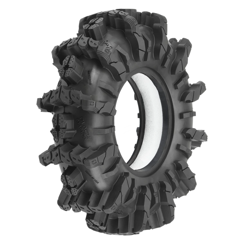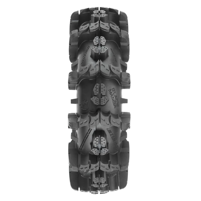 This is a pair of Interco® Black Mamba 2.6″ Mud Truck Tires. Pro-Line is proud to announce fully licensed Interco® Black Mamba 2.6″ tires specifically designed for extreme mud truck action! These massive 6″ tall x 1.86″ wide tires are perfect if you are looking to do some Mud Bogging with your rig. Transform your Black Mamba tires into an even narrower and more extreme mud tire when you combine them with Pro-Line’s Vice CrushLock 2.6″ Bead-Loc wheels (PRO278903).
