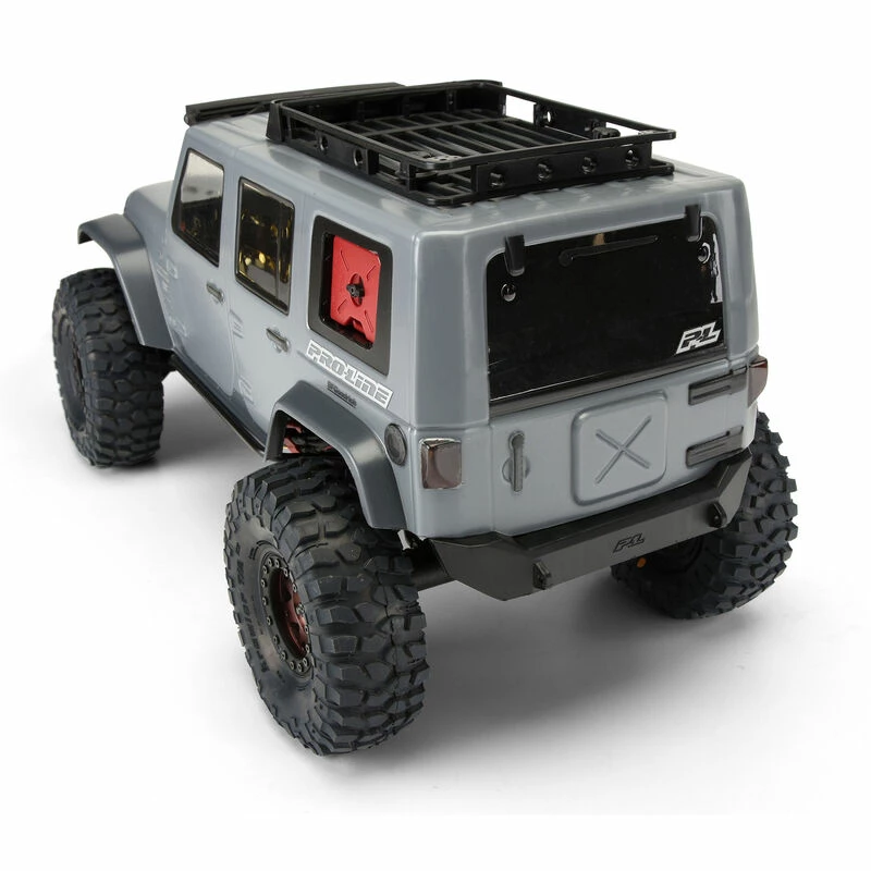 This is the Pro-Line Jeep® Wrangler Unlimited Rubicon Clear Body. The Jeep® Wrangler Unlimited Rubicon body. Rugged, tough and soon to be classic styling are now available from Pro-Line for 1:10 Scale Builders and Rock Crawler owners. The Jeep® Wrangler Unlimited Rubicon is one of the first RC bodies to offer innovative hi-detail features such as front and rear bumpers and taillight lenses that are easily attached with double stick tape or hardware of your choice. It’s Jeep® styling is a perfect match to it’s full size counterpart that made it an automotive classic. Made from super strong lexan material, the Jeep® Wrangler Unlimited Rubicon is ready for off-roading in a dirt field or rock mountain near you.