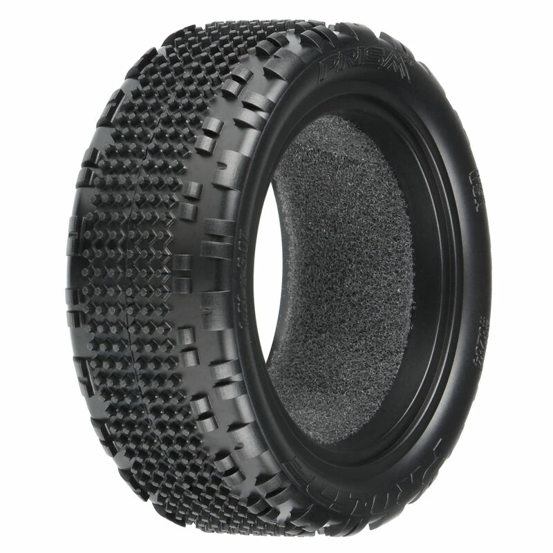 This is a pair of Prism 2.0 2.2″ 4WD Front Carpet Buggy Tires. The Prism 2.0 features a new carcass shape that provides more steering in low speed corners and more forgiveness and stability at high speeds. The second-generation Prism features the same iconic hook shaped pins combined with Prism shaped pins for incredible forward grip. Z3 (Medium) and Z4 (Soft) compounds have been developed specifically for the needs of Indoor Carpet racing. The Prism 2.0 4WD Front tire perfectly pairs with Pro-Line’s Prism Rear tire for ideal carpet racing performance.