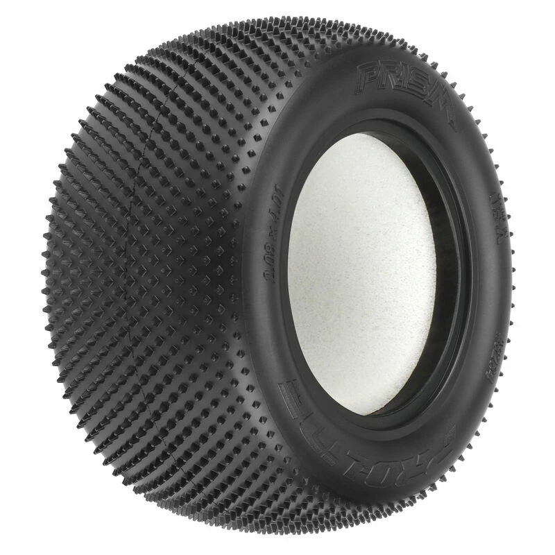 This is a pair of Prism Stadium Truck Rear Carpet Tires. Introducing the all-new Prism Carpet Truck Rear race tire! The Prism features 1,440 Ultra-Sharp Prism shaped Pins laid out in a unique pattern that grip the carpet better than Velcro®. The pins on the Prism are slightly smaller than the original Pin Point rear tire but there are many more of them, which results in faster and more consistent lap times. The Prism has been positioned with the knife edge pointed front to back and side to side for maximum grip and to stay sharp even as they wear down. The Prism T perfectly pairs with Pro-Line’s Prism T Front (PRO8287) tire for ideal carpet racing performance. The Prism tire is destined to change the carpet racing scene; be the first one with the fastest carpet tire yet – Pro-Line’s Prism!