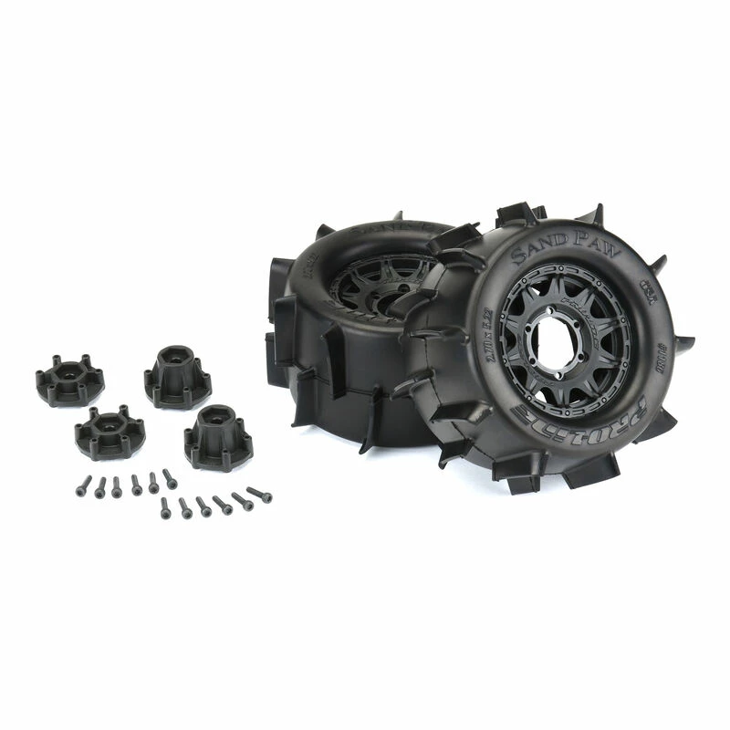 PRO118610 | Sand Paw 2.8″ Sand Tires Mounted on Raid Black 6×30 Removable Hex Wheels (2) for Stampede® 2wd & 4wd Front and Rear