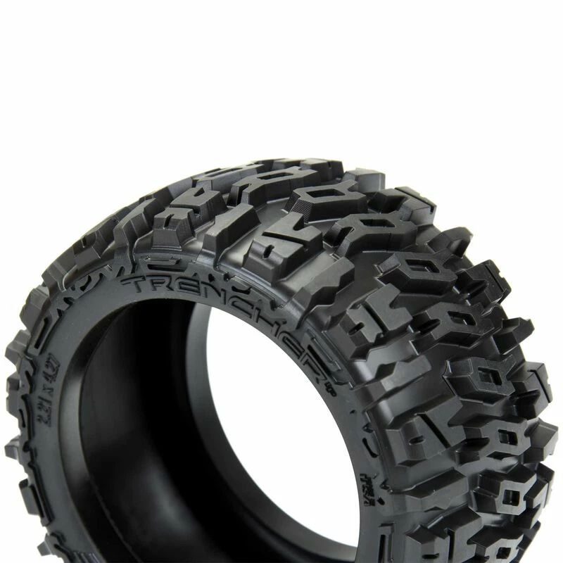 This is a pair of pre-mounted Trencher LP 2.8″ Tires. Introducing the Trencher LP (Low Profile) 2.8″ All-Terrain Tire that is perfect for your Rustler® 2wd or Rustler® 4×4! Whether it is loose or hard-packed dirt, sand, snow, street or gravel the Trencher LP 2.8″ tire is up to the task. The Trencher tread was designed to have ultimate traction combined with long-lasting durability. Each tire lug is shaped to dig into whatever surface you are running on and is ultra-thick so that it is extremely durable. The Trencher tread design has even won the RC Car Action Readers Choice Award 4 times and is a favorite among bashers everywhere!