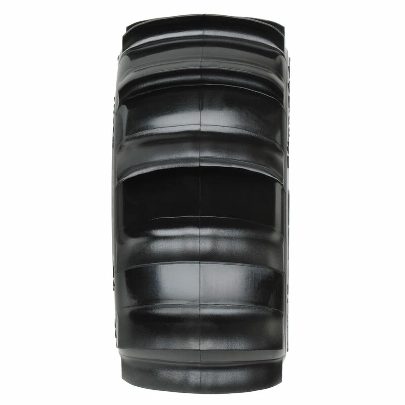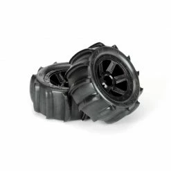 This is a pair of pre-mounted Sling Shot 2.2 in Paddle Tires. The newest form of fun is here with the release of the Sling Shot 2.2 in paddle tire mounted to Desperado wheels for mini E-REVO trucks! The Sling Shot provides hours of fun in the sand, snow or even in the occasional mud pit. The 12 paddle design ensures maximum performance due to the true scoop design coupled with low roll outer sidewalls. The Sling Shot comes complete with foam inserts and big Pro-Line fun!