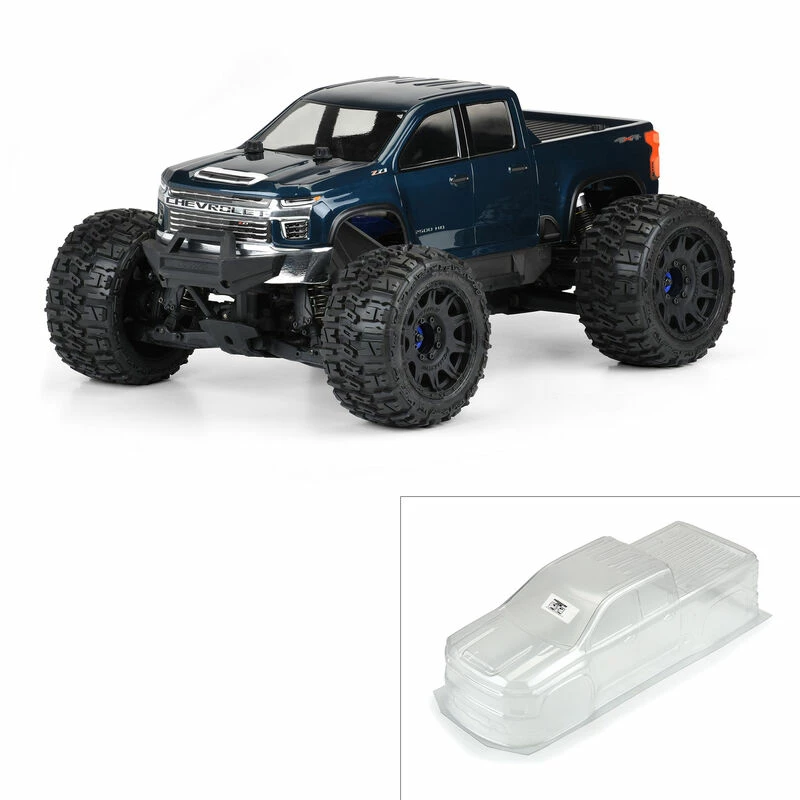Pro-Line is proud to bring the latest Chevy® Silverado™ 2500 HD body style to your Monster Truck! Pro-Line has carefully recreated the details of the new 2500 HD and made it fit the E-REVO® 2.0 and MAXX® when using Extended Body Mounts like Pro-Line’s PRO630700 or PRO637000. Proudly Made in the USA, this body is made from durable polycarbonate material that allows you to put your custom paint job onto your body. Paint-then-peel overspray film, window masks, and scale Pro-Line decals are included with the body to take it to the next level. Don’t roll up with the same body as everyone else; get your own 2021 Chevy® Silverado™ 2500 HD Clear Body today!