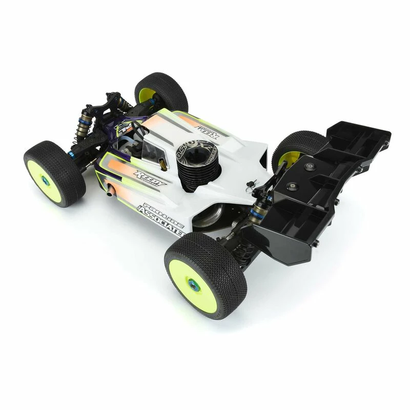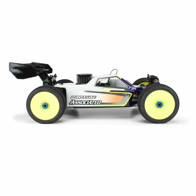 This is an Axis Clear Body for AE RC8B3.2 Nitro & Electric. Introducing the Axis series of race bodies for 1:8 buggy, a clean-sheet design from Pro-Line bringing a fresh new look to the class. Designed with the latest in CAD technology, the Axis features a super low-slung design with sharp lines throughout giving it an unmistakable look on the track. The Axis is a cab-forward design that provides enhanced steering response while the small side fins balance out the rear of the car with ideal side-bite. The rear of the Axis body has the right amount of clearance for the nitro engine and fits the chassis and bulkhead shape of your race buggy perfectly. To run the Axis body on the RC8B3.2e electric buggy, the battery must be no taller than 39mm due to the low-slung nature of the Axis side pods.