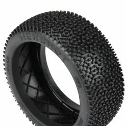 This is a pair of Hex Shot 1/8 Buggy Tires. Introducing the Hex Shot 1/8 Buggy race tire, a stepped-pin tire designed to tackle loose and loamy tracks. Beefy pins are arranged in rows of hexagon-shaped pods down the center of the tire, while the smaller outer tread is made up of connected chains of pins. The step-pin design helps support the tall pins while your buggy carves through loose dirt, providing excellent forward grip and braking stability.